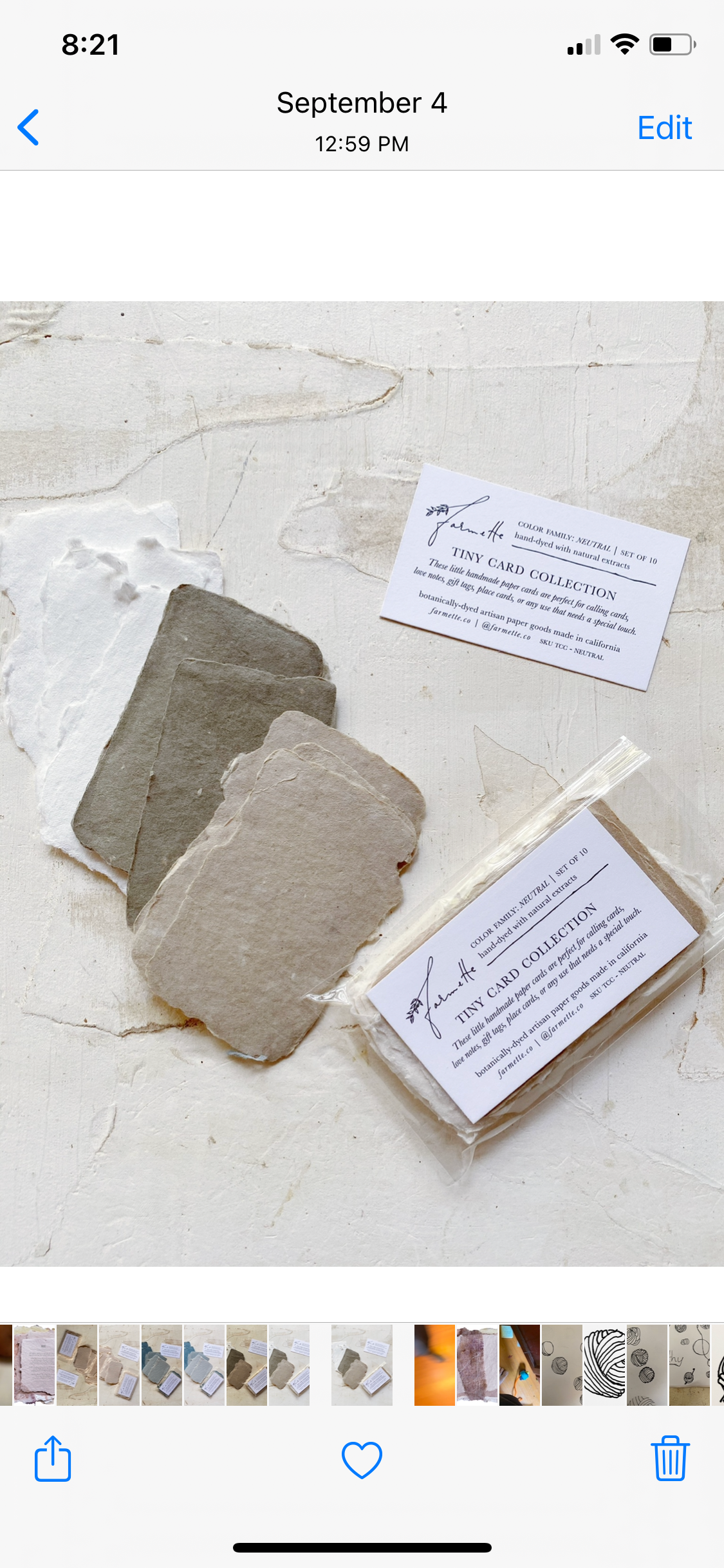 Set of 10 blank handmade paper cards with four full deckled edges. Neutral collection contains whites, grays, tans and blushes. Includes hues from our collection and other tones; at least two colors per set. Approximately 2 1/4 by 3 3/4-4 1/4 inches.